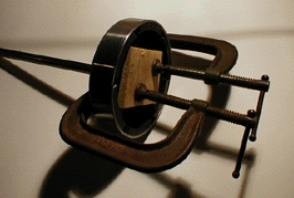 The alternator comes with a 1" diameter "spline" hole in the center. You will have to use a sprocket to adapt the rotor to your 5/8" shaft. Center the sprocket on the inside of the rotor, and clamp down using the "C' clamps and thin wood piece, as shown. Spin the rotor on the shaft to make certain it is ABSOLUTELY straight, with NO wobble! Remove the shaft from the sprocket hub. Lightly tack the sprocket to the rotor with a welder. Remove the clamps, re-insert the shaft and rotate the rotor again to ensure straightness. |