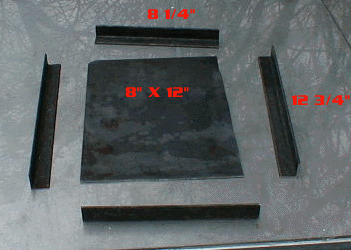 Weld the base of the unit together, with the angle steel pieces extending just over the edge of the base plate. Align your aluminium or wood blocks to the outside edges of the base as shown in photo "A" (below). Drill four holes for each block in the base plate. Using your holes as a guide, drill tap holes through the plate into the wood blocks from the underside of the base. Screw one block into place with lag screws from the underside of the base. When using aluminum blocks, you will have to drill and tap the blocks, substituting machine screws for lag screws. |