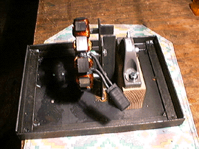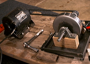 This is the unit belted to an electric motor for testing purposes. Attach the pulley to the shaft as shown in the upper right corner of the above photo. There are holes drilled in the corners of the baseplate. The baseplate is attached to the wood base with lag screws. Notice how the unit is at an angle to the wood base. This provides belt tension. To further tighten the belt, simply screw down the back two lag screws. |