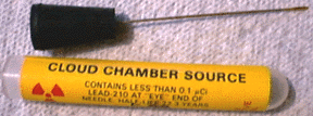 The styrofoam container was filled with dry ice that was crushed to a powder. A thin copper sheet was placed directly on top of the dry ice. A disc of thin black cardboard (included with the cloud chamber) was placed on the copper sheet. An absorbent paper strip was dipped in pure denatured alcohol (ethanol) and fitted to the inside of the chamber. The chamber was placed upside down on the cardboard disc (on top of the copper plate). A pin tipped with alpha-emitting lead-210 (also purchased from Cenco) was then inserted into the hole on the side of the chamber.