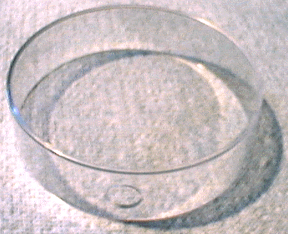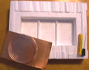 The instructions that came with it stated that the plastic vessel be used upright, with the lid on. Poor results were obtained using this method. Instead, we discarded the plastic lid and inverted the dish . A styrofoam piece, once used for shipping, was cut to the right size with a hot nichrome wire, forming an insulated container that can hold nearly a pound of dry ice.